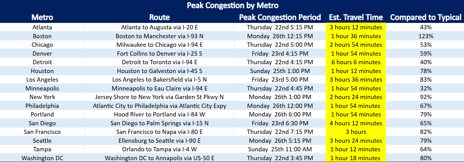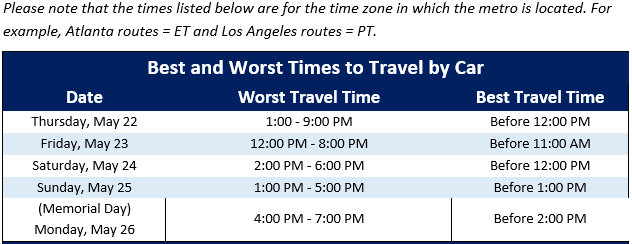 INRIX, a provider of transportation data and insights, expects the afternoons over Memorial Day weekend to be the most congested. Travelers should hit the road during the morning hours. Boston, New York, Los Angeles, San Francisco, and Washington, DC are the metros that can expect the heaviest traffic.