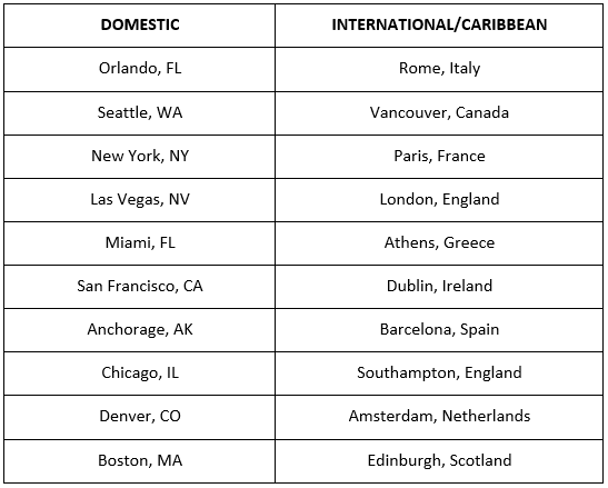 The top holiday destinations listed below are based on AAA booking data for trips between Thursday, May 22 and Monday, May 26. Orlando tops the domestic list thanks to its popular theme parks and nearby cruise port, Port Canaveral. Cruising is also the reason Seattle and Anchorage made the top 10 list, since Memorial Day kicks off peak Alaska cruise season. Internationally, Rome is the number one destination. Vancouver is also popular because of its cruise port. The rest of the list is made up of all European cities, as those destinations continue to draw high volumes of visitors.