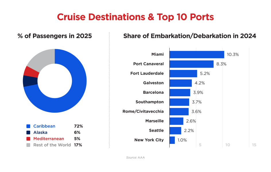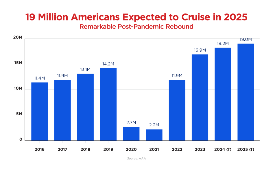 AAA projects 19 million Americans will go on cruises this year, a 4.5% increase over 2024, when 18.2 million Americans went on cruise vacations. 2025 is expected to be the third straight year of record cruise passenger volume. The cruise industry has rebounded post-pandemic more strongly than other travel segments, and cruise demand has exceeded hotel demand the last two years.