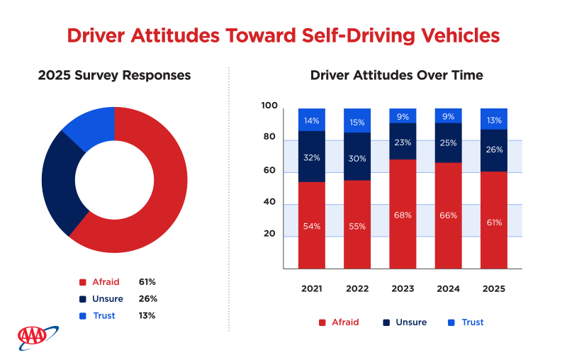 According to AAA’s latest survey on autonomous vehicles, 13% of U.S. drivers would trust riding in self-driving vehicles – an increase from last year, when this number was 9%. Despite this slight increase, 6 in 10 U.S. drivers still report being afraid to ride in a self-driving vehicle. For drivers, enhancing vehicle safety systems remains a priority over the development of self-driving, with interest among drivers decreasing from 18% in 2022 to 13% this year.