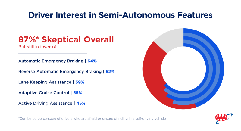 "Most drivers want automakers to focus on advanced safety technology," said Greg Brannon, the automotive engineering director at AAA. "Though opinions on fully self-driving cars vary widely, it's evident that today's drivers value features that enhance their safety."